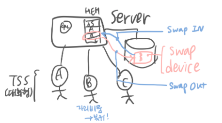swap out: RAM에서 ProgramB를 내쫓고 서버의 HDD에 둠- 서버의 HDD에 저장된 B를