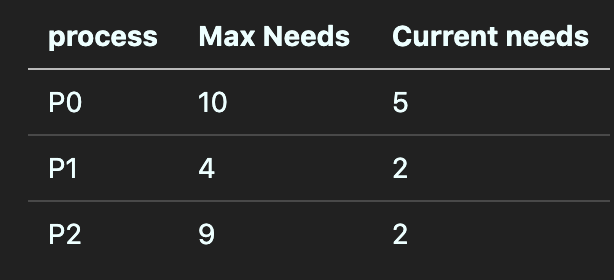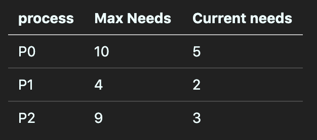 예를들어서, 12개의 magnetic tape가 있고, 3개의 process P0, P1, P2가 처리를 요청했다. 그리고 현재 필요한 자원은 Current Needs, process가 처리되기 위해 필요로 하는 max needs는 다음과 같다.