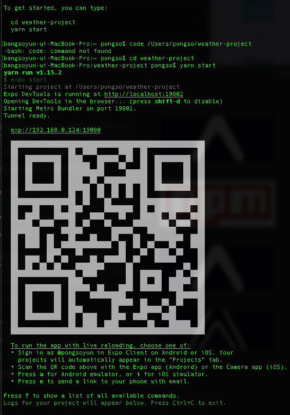하지만 다행히도 expo cli를 설치하면 이제 따로 xde의 필요 없이 터미널에서 보여주는 qr코드를 촬영만 하면!!