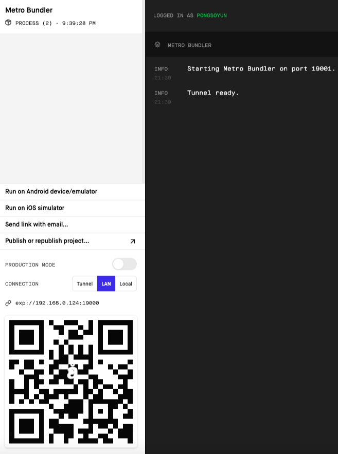 (참고로, expo cli 앱을 사용할 디바이스와 개발 PC는 같은 네트워크를 사용하고있어야합니다)