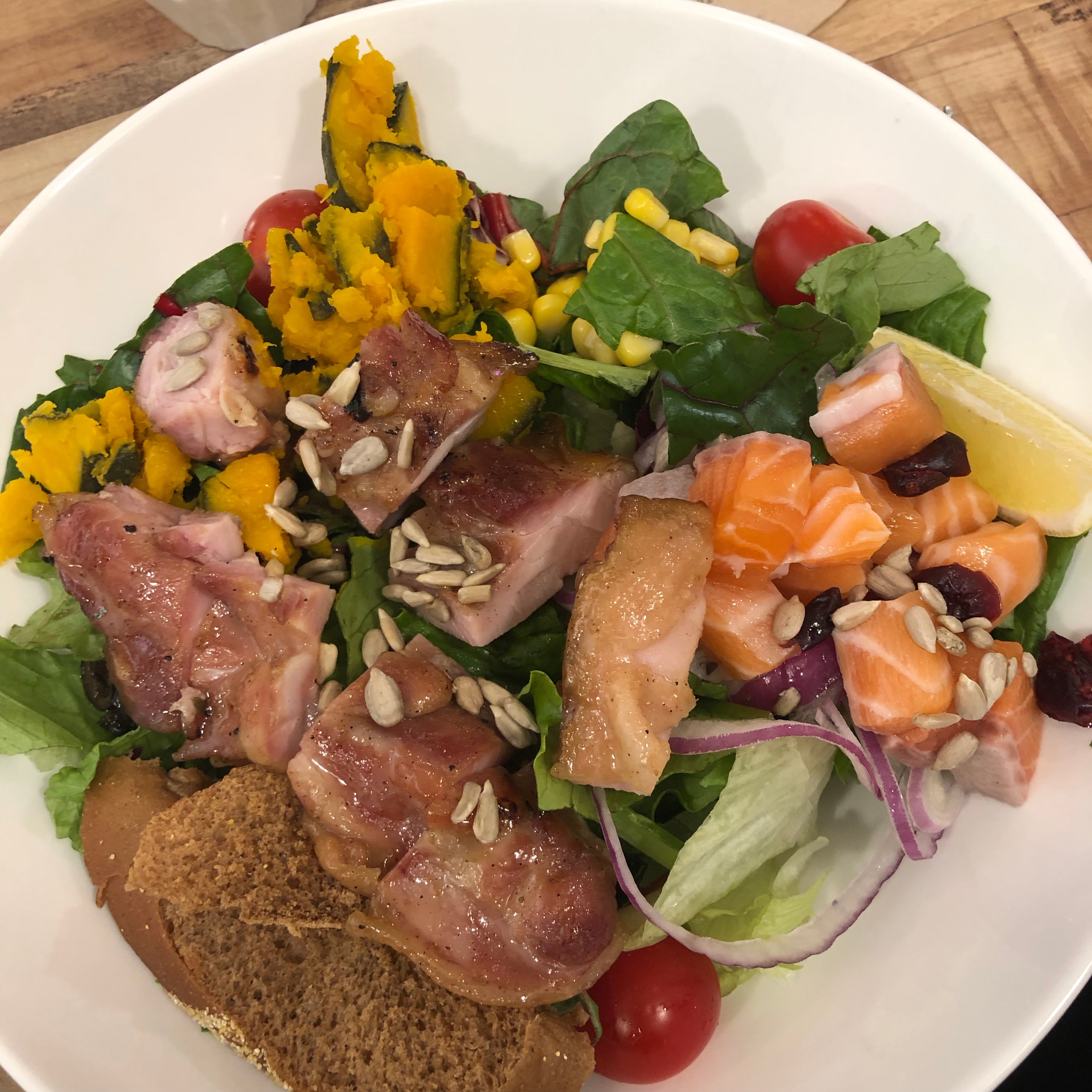 추천메뉴: 닭다리살샐러드에 계란, 연어 추가, 오리엔탈소스