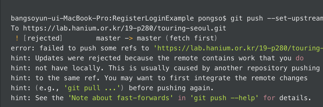 Updates were rejected because the remote contains work that you do hint: not have locally. This is usually caused by another repository pushing hint: to the same ref. You may want to first integrate the remote changes hint: (e.g., ‘git pull …’) before pushing again.